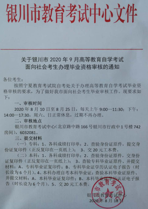 關(guān)于銀川市2020年9月高等教育自學(xué)考試面向社會(huì)考生辦理畢業(yè)資格審核的通知