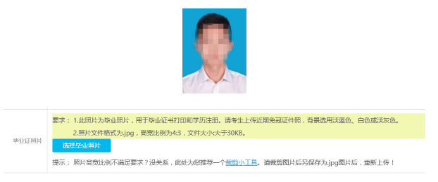 第三步:上傳畢業照片,照片要求見下圖,如不能滿足條件可以使用圖片編輯軟件進行裁剪,裁剪時應保證臉部區域占照片70%-80%。填寫完畢點擊【保存并下一步】,進入下一頁面。