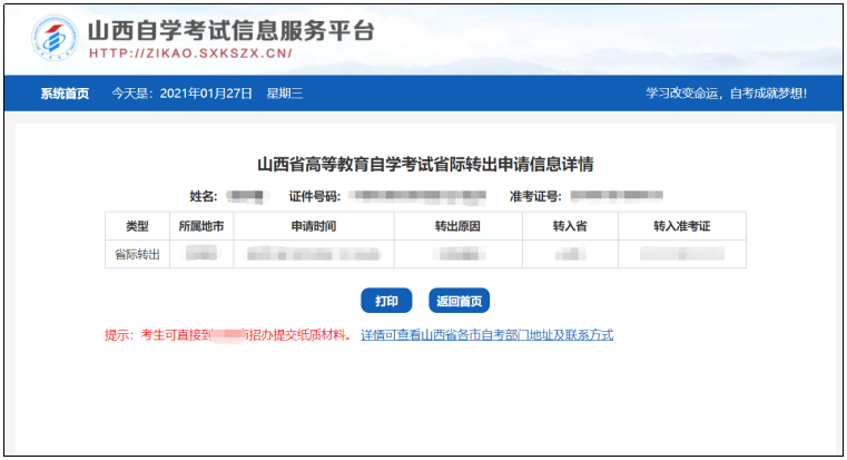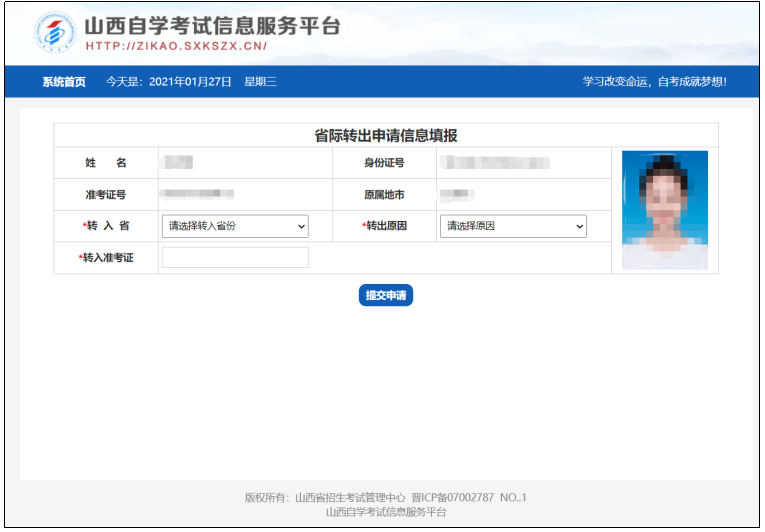 1、確認申請信息,選擇轉入省、轉出原因、填寫準考證,確認轉考信息無誤后提交申請。