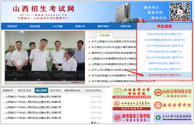 (一)考生登錄山西招生考試網(http://www.sxkszx.cn),先選擇“考生登錄”,然后選擇“自學考試考生網上服務平臺”。