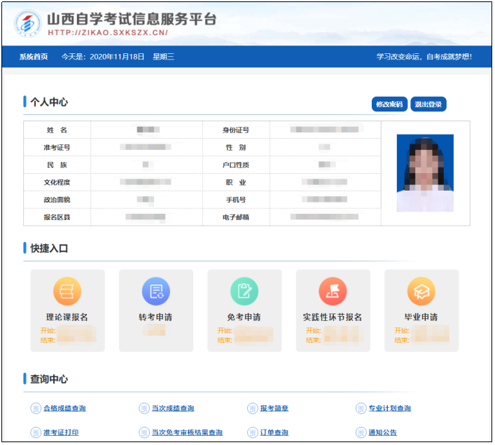 (四)個人中心,考生身份認證通過后即可登錄系統,登錄成功后進入“個人中心”。考生可通過快捷入口和查詢中心辦理相關業務。