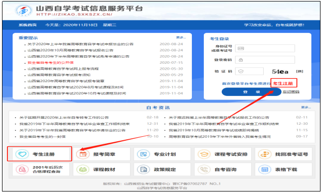 (二)進入“山西自學考試信息服務平臺”,考生可以通過“身份證號或準考證號”+“密碼”登錄系統。未獲得登錄密碼的在籍考生需要進行考生注冊。